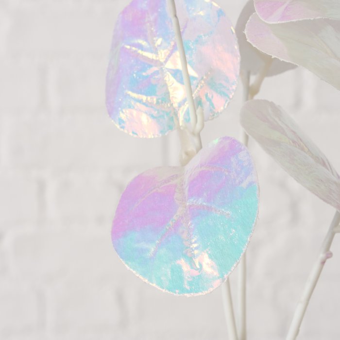 Du suchst einen eye-catcher für deine Vase? Dieser weiß schimmernde Dekozweig verleiht deiner Deko einen eleganten Glanz. Die irisierenden Blätter spielen je nach Licht in Pastelltönen – perfekt für Winter- und Festtagslooks, aber auch ganzjährig in modernen Arrangements.