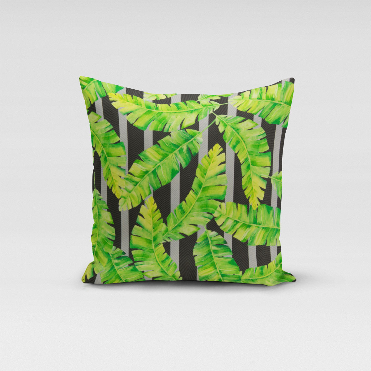 - Du erhältst eine Kissenhülle aus teflonbeschichtetem Outdoorstoff im Digitaldruckverfahren bedruckt mit fallenden, grünen Palmenblättern vor einem schwarz und grau gestreiften Hintergrund