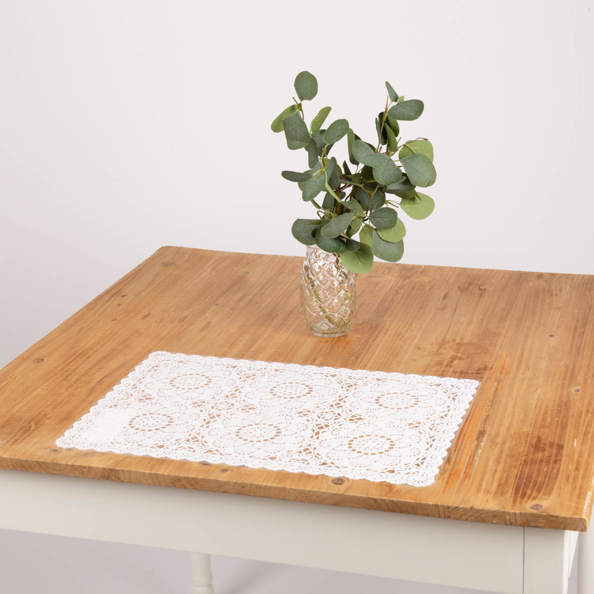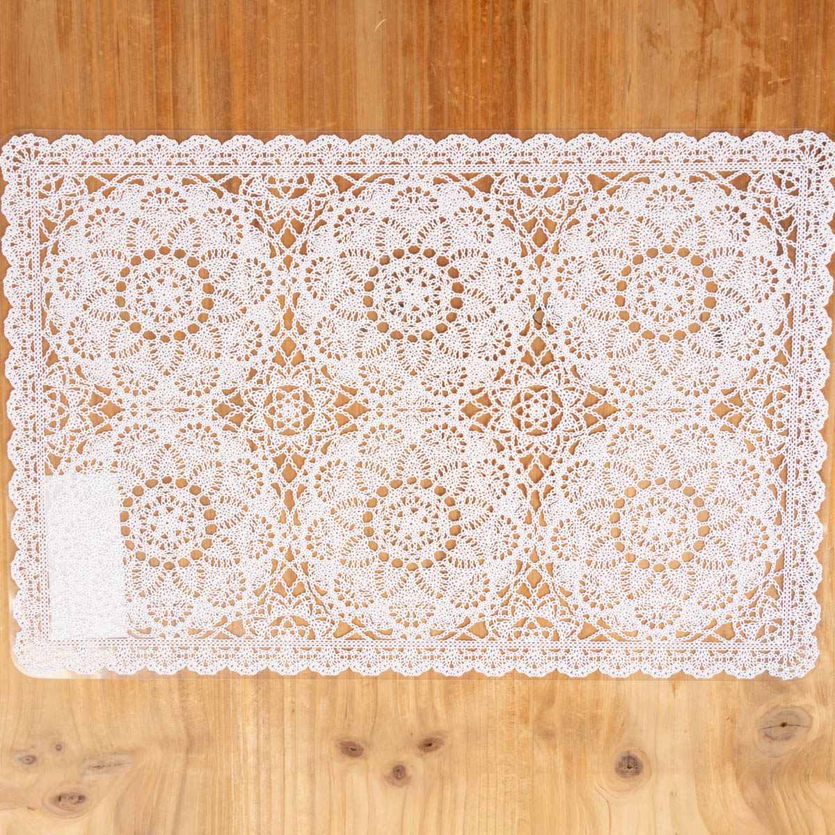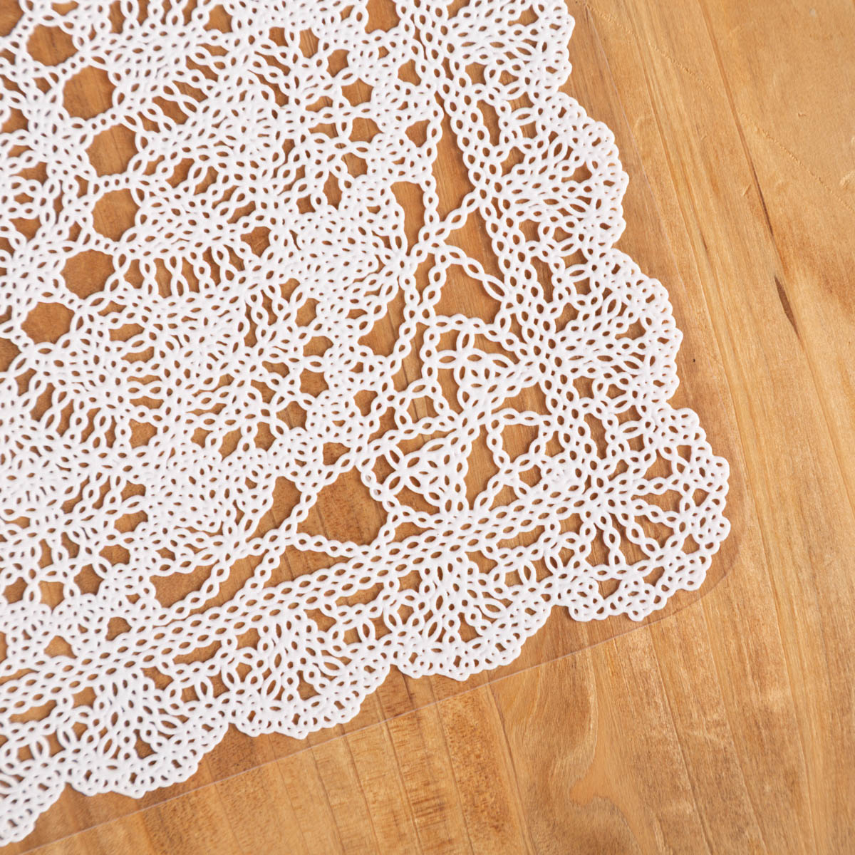 Das Set wirkt auf den ersten Blick wie ein gehäkeltes Deckchen, ist aber tatsächlich zu 100% aus pflegleichtem Kunststoff.
