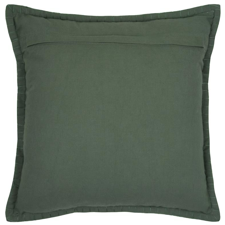 Die Rückseite ist uni grün gehalten und mit einem praktischen Reißverschluss ausgestattet. Dadurch lässt sich die Füllung aus Polyester entnehmen, was das Kissen besonders pflegefreundlich und flexibel macht.
