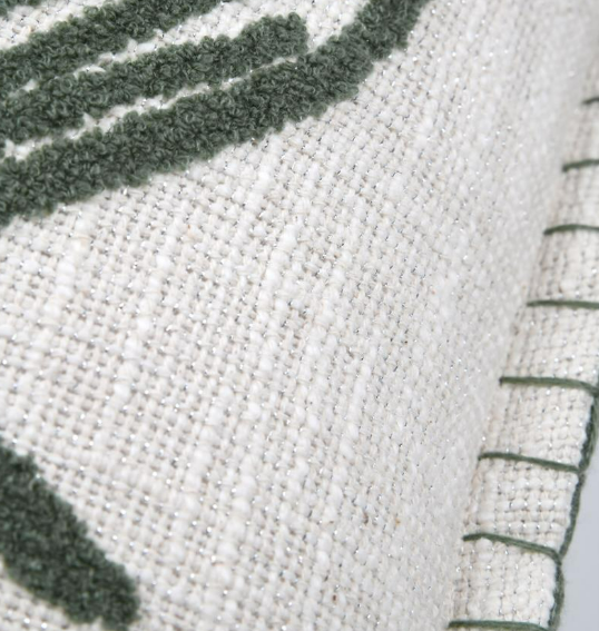 Dieses hochwertige Dekokissen mit getuftetem Monstera-Blatt bringt stilvolle Natürlichkeit in dein Zuhause. Das exklusive Dessin aus Frankreich verbindet ein modernes Blattmotiv mit einer feinen Struktur und dezenten silberfarbenen Glitzereffekten. So entsteht ein eleganter Blickfang für Sofa, Sessel oder Bett.