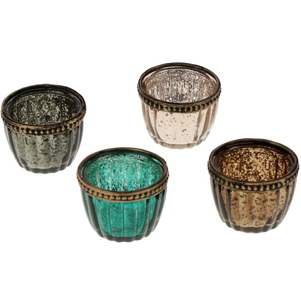 Bringe warme Lichtakzente in dein Zuhause – mit diesen dekorativen Teelichthaltern aus Glas und detailreichem Metallrand. Die gerillte Struktur sorgt für ein schönes Schattenspiel, sobald du ein Teelicht darin entzündest. Du erhältst eine der vier attraktiven Farben (grau, rose-gold, türkis oder grün). Online ist leider keine Farbauswahl möglich, aber wir geben unser Bestes, deine Wünsche zu berücksichtigen.