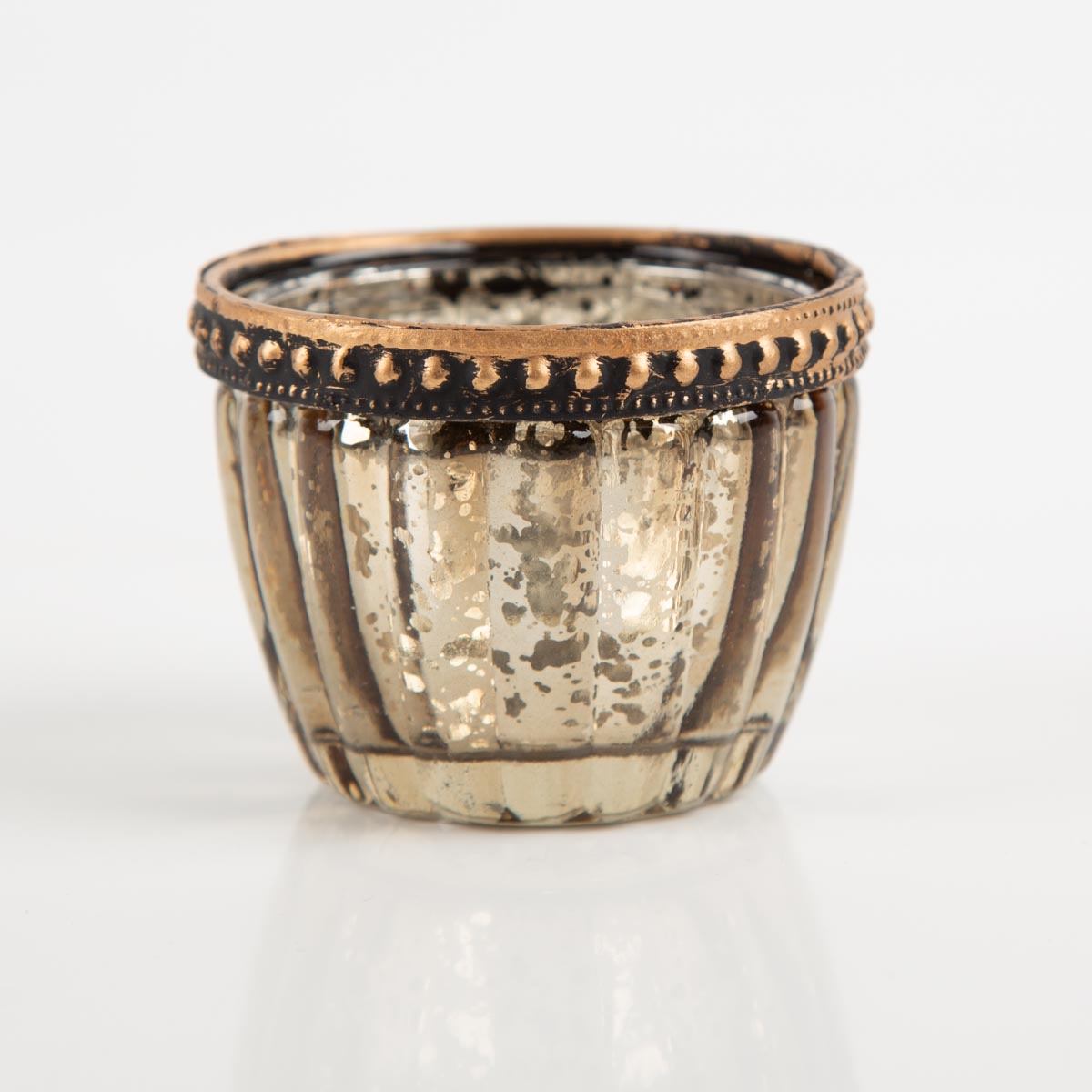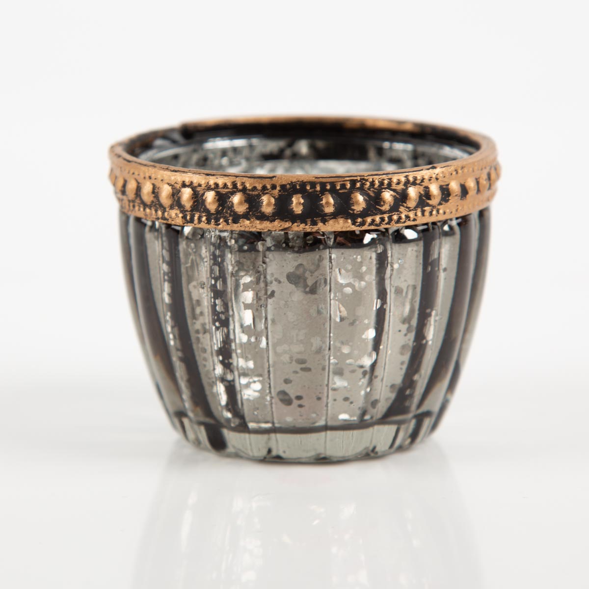 Dekorativer Teelichthalter aus gerilltem Glas mit edlem Metallrand