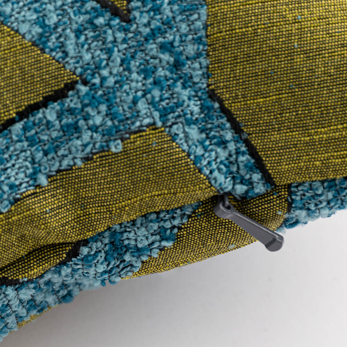 Das grafische Muster wirkt sehr modern und durch die unterschiedlichen Stoffarten, die hier aufeinandertreffen, hebt es sich besonders gut vom Grundgewebe ab. Typisch für Boucle sind die abstehenden, unterschiedlich großen Schlingen, Knötchen und Noppen, die für einen ausgesprochen mondänen Look sorgen. An der unteren Naht befindet sich der Reißverschluss, durch den eine Füllung aus Federn oder Kunstfasern eingefügt werden kann.