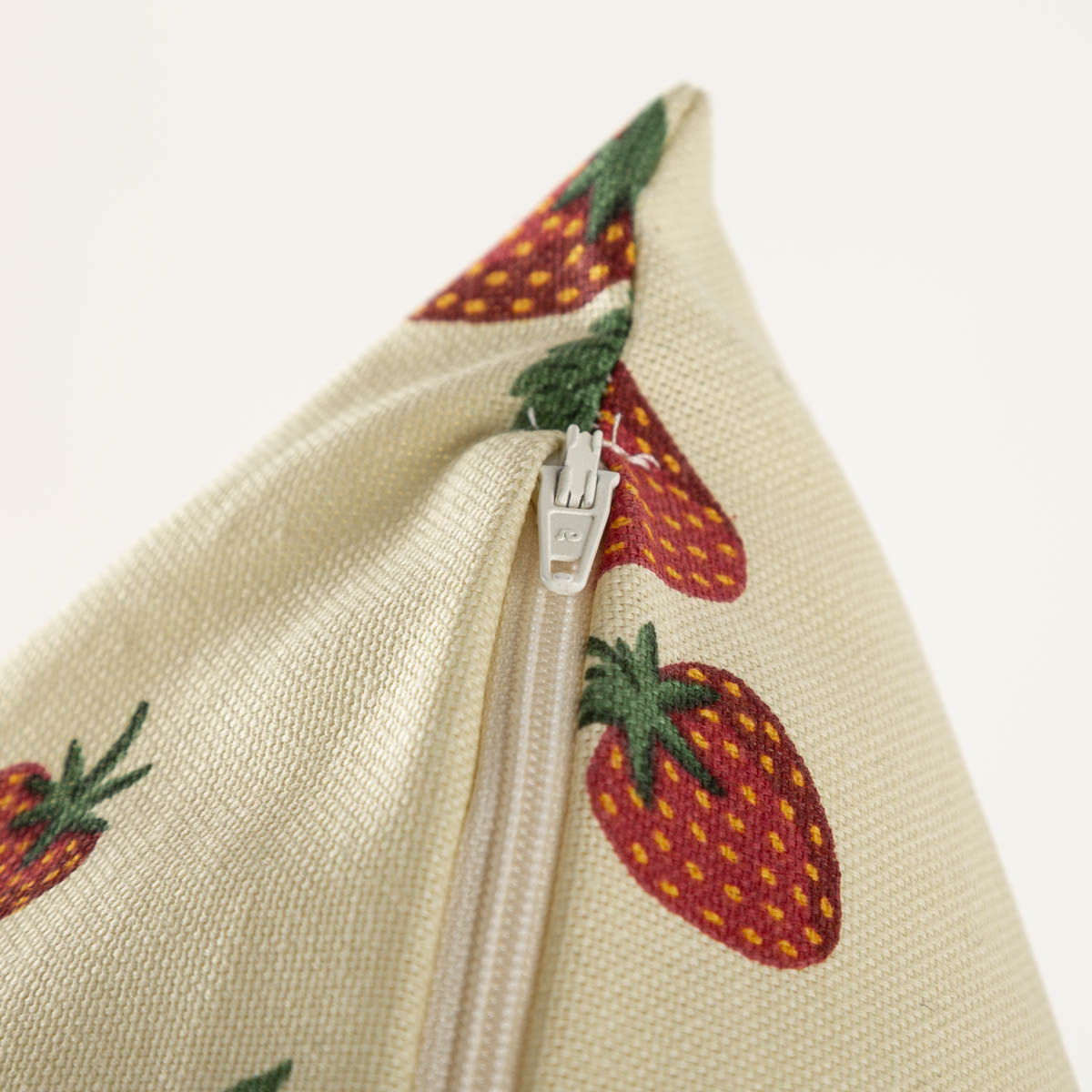 Die Kissenhülle Strawberry Happy Fruit aus unserer SCHÖNER LEBEN. Kollektion ist überall ein wunderschöner Hingucker, der sommerlich-frische Akzente setzt! Die Kissenhülle in einem zarten Vanille-Ton mit Erdbeer-Print in Rot und Grün hat einen natürlichen Charakter und ist aus robustem Halbpanama-Stoff mit 80% Baumwollanteil genäht.