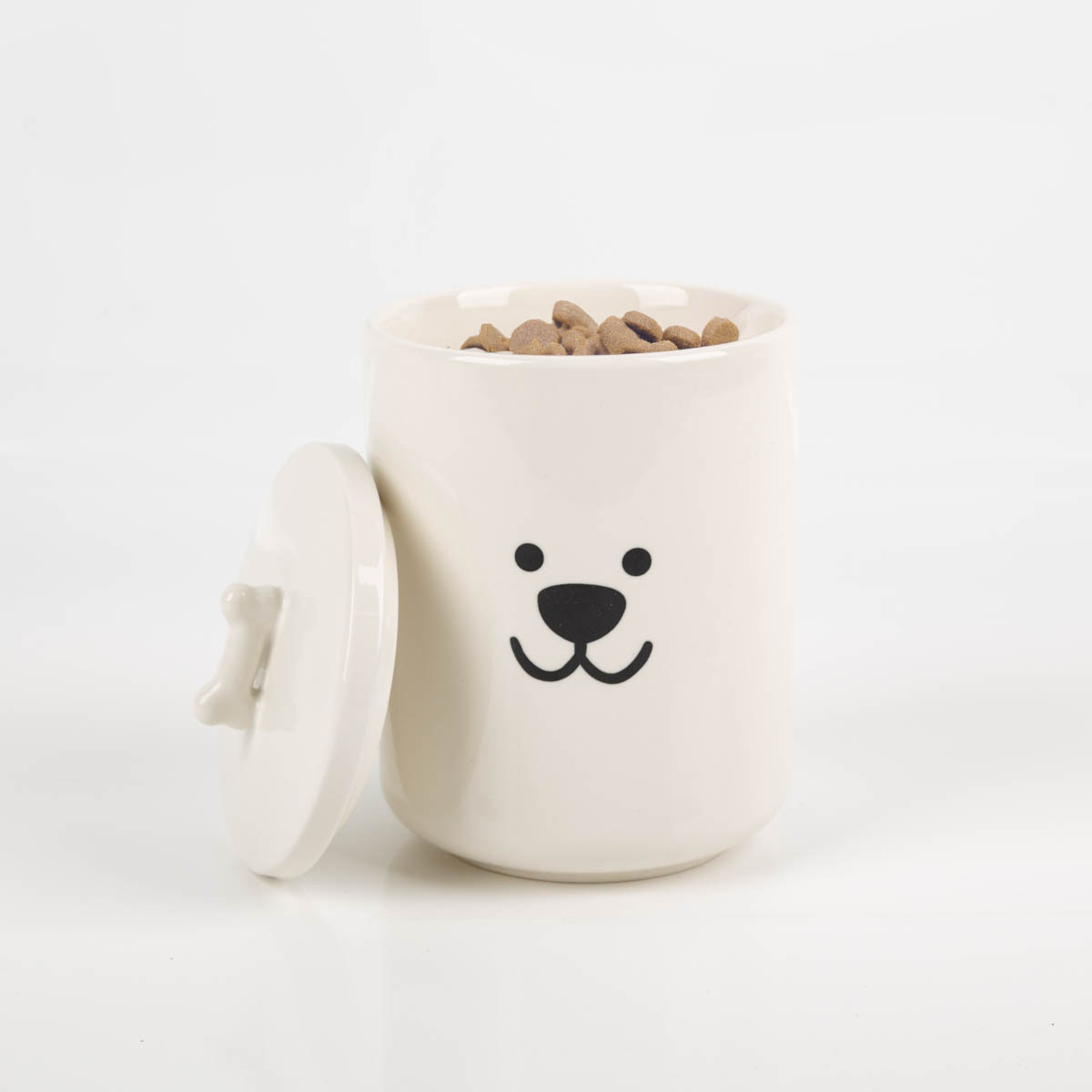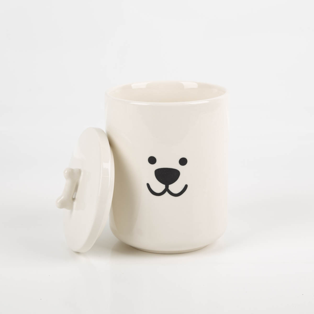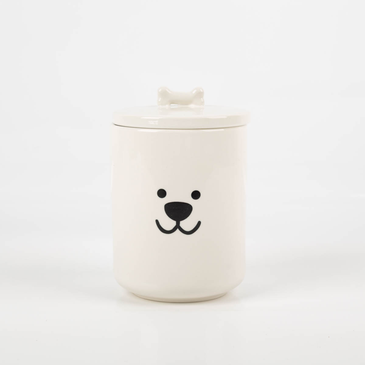 Diese weiße Vorratsdose ist dein hübscher Ordnungshelfer mit Hundemotiv. In die Dose aus Keramik (New Bone) passen bis zu 850 ml – ideal für Hundeleckerlis, Kaffee, Tee, Zucker, Salz oder Wattepads. Der runde Deckel hat einen gut greifbaren Knochen-Griff. Praktisch im Alltag: Die Dose ist lebensmittelgeeignet, mikrowellengeeignet und spülmaschinengeeignet. Dank der glatten Oberfläche lässt sie sich außerdem schnell reinigen.