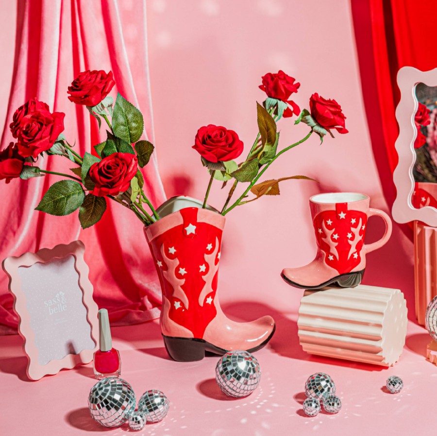 Sass & Belle Tasse Cowboy Stiefel rosa/rot – 280ml handbemalt
