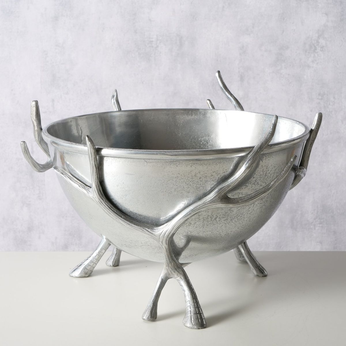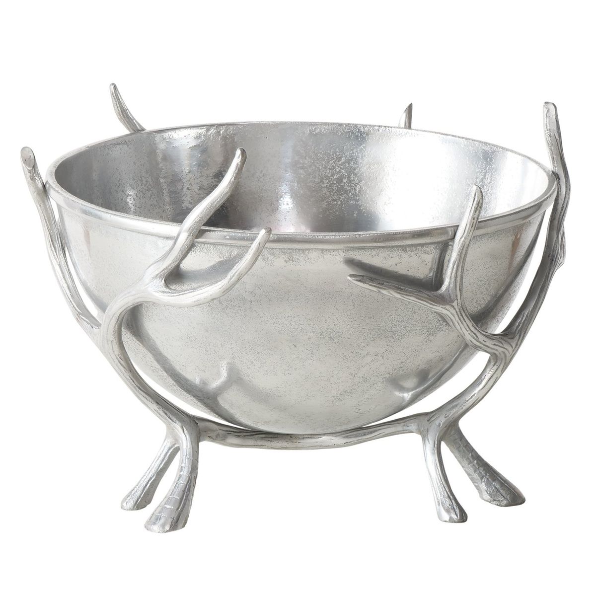 Mit diesem außergewöhnlichen Flaschenkühler setzt du Getränke eindrucksvoll in Szene. Die großzügige silberfarbene Kühlschale wird von kunstvoll gestalteten Hirschgeweihen getragen, die zugleich als dekorative Standfüße dienen. So verbindest du praktischen Nutzen mit markanter Optik und holst dir ein Wohnaccessoire nach Hause, das sofort Aufmerksamkeit erzeugt.