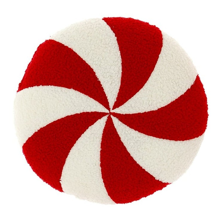 Dieses runde „Candy“-Kissen sorgt sofort für festliche Gemütlichkeit. Die weiche Teddy-Oberfläche lädt zum Reinkuscheln ein, die Vorderseite zeigt das typische rot-weiße Candy-Wirbelmuster, die Rückseite ist uni rot. Gefüllt und direkt einsetzbar.
