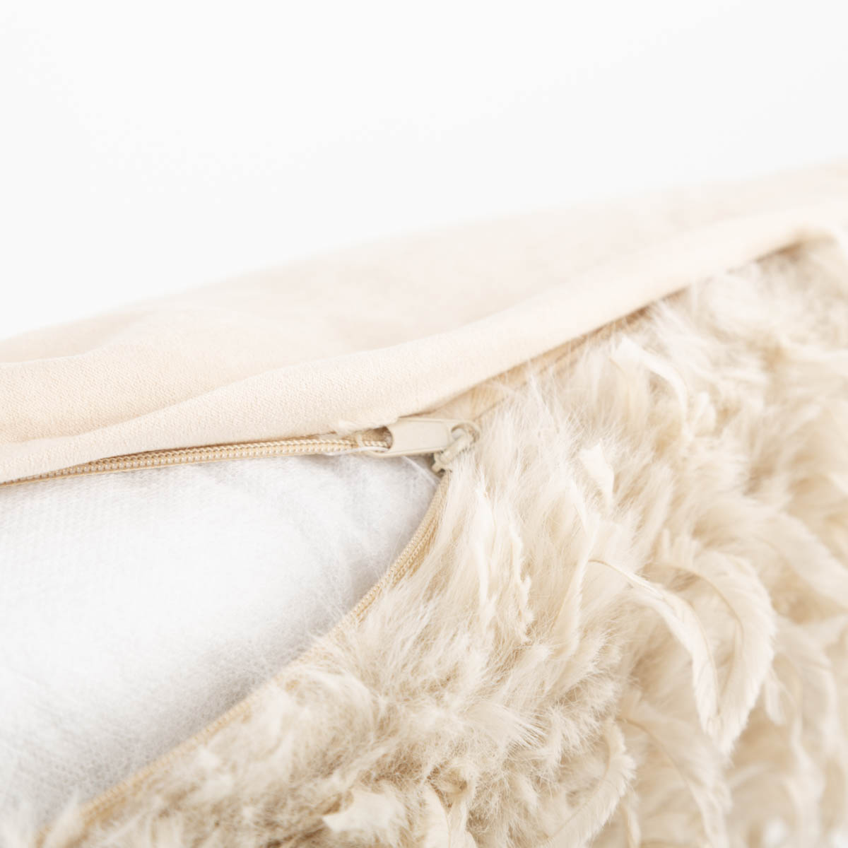 Das Kuschelkissen Romeo verbindet außergewöhnliches Design mit gemütlichem Komfort. Auf der Vorderseite begeistert es mit einer besonderen Fell-Optik aus weichem Plüsch und fedrigen Fransen, die dem Kissen eine spannende Struktur verleihen. Die Rückseite ist schlicht in uni sand gehalten und sorgt so für einen harmonischen Kontrast.