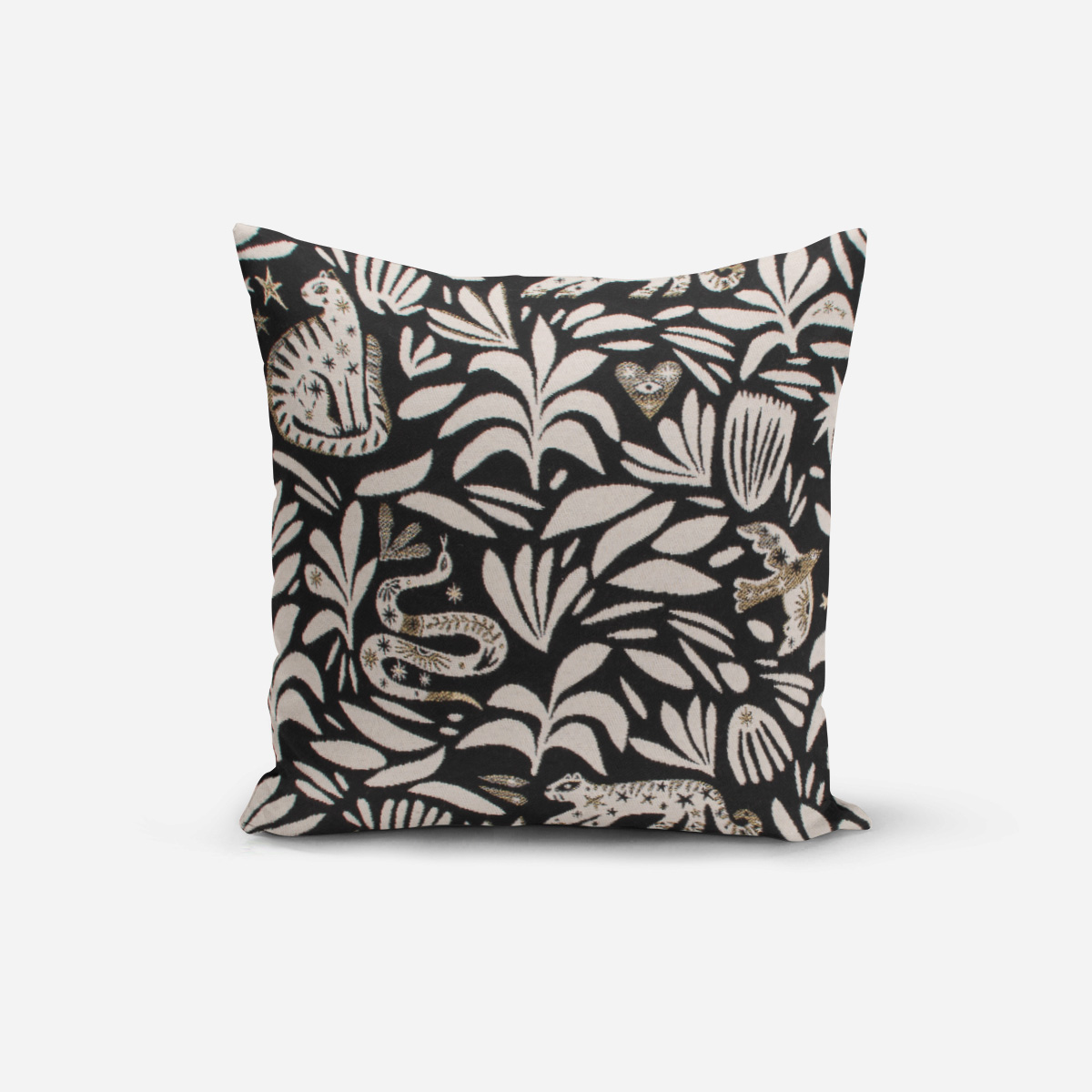 SCHÖNER LEBEN. Kissenhülle aus Jacquardstoff Mystik Blätter Schlange Vogel Wildkatze schwarz weiß goldfarbig verschiedene Größen