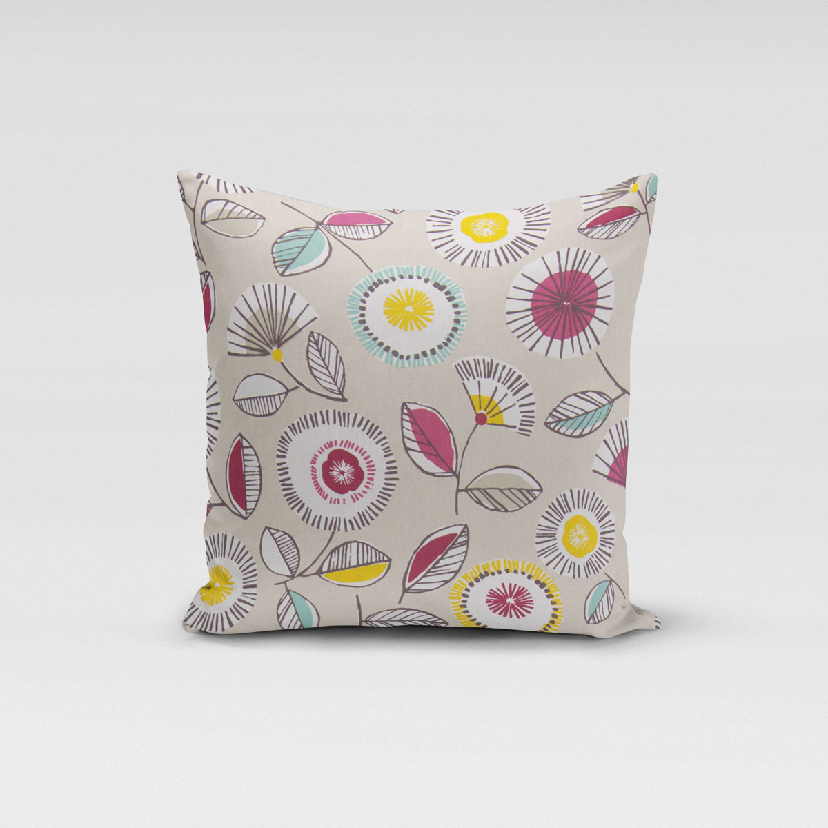 - Du erhältst eine Kissenhülle bedruckt mit stilisierten Blumen auf beigefarbigen Hintergrund