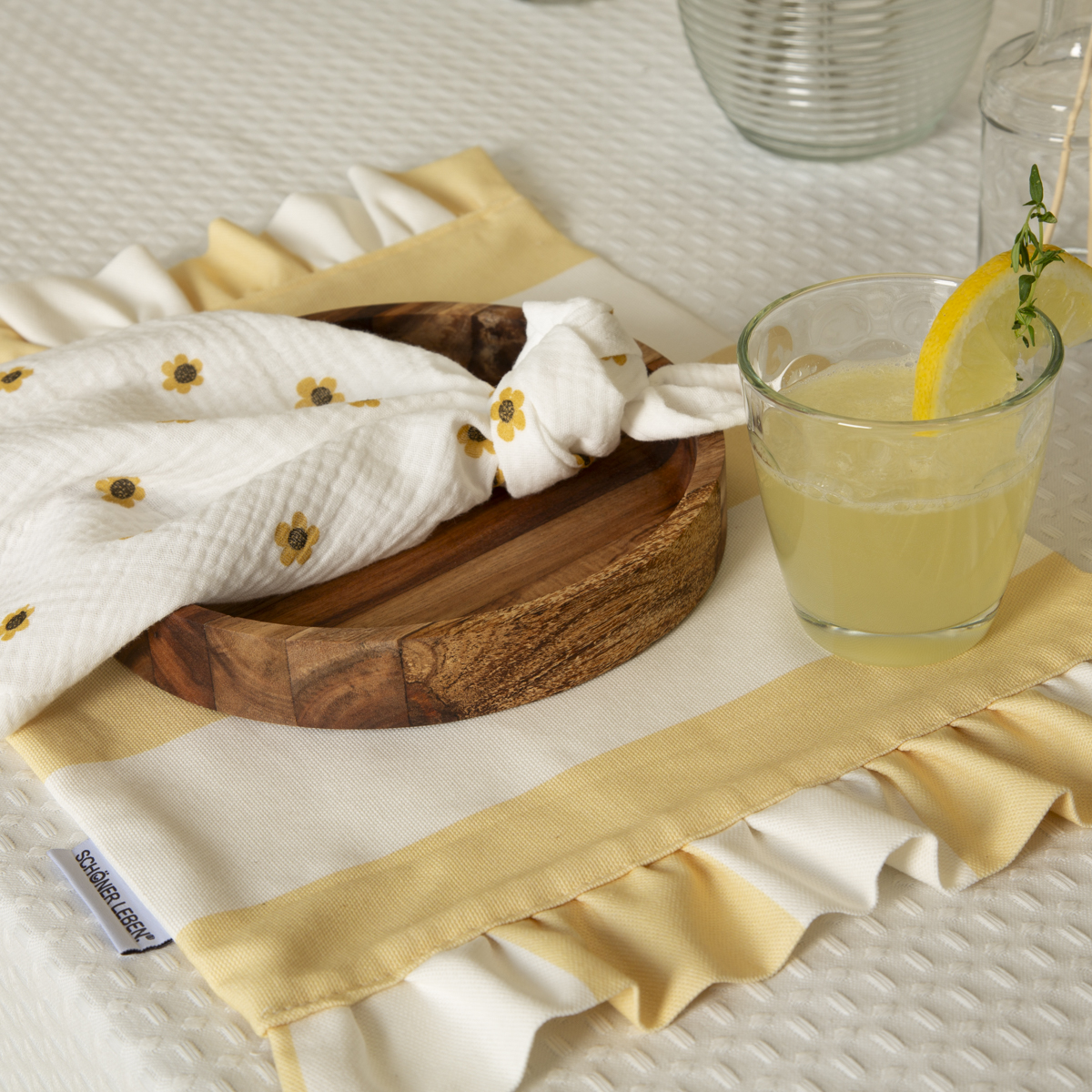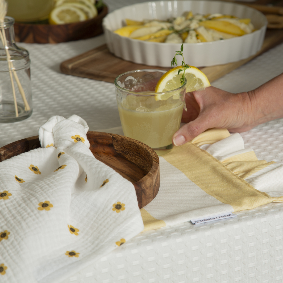 Du suchst nach einer stilvollen Alternative zu Papierservietten? Dann greif zu den handgefertigten Stoffservietten von SCHÖNER LEBEN.! Dieses 4er Set bringt frischen Wind auf deinen Tisch: zartes Blütenmuster in Weiß und Gelb auf luftig-leichtem Double Gauze Musselin. Das hübsche Dessin mit kleinen gelben Blüten ist ein Schmuckstück für jede Tafel und verleiht deinem gedeckten Tisch eine natürliche, frische Note.