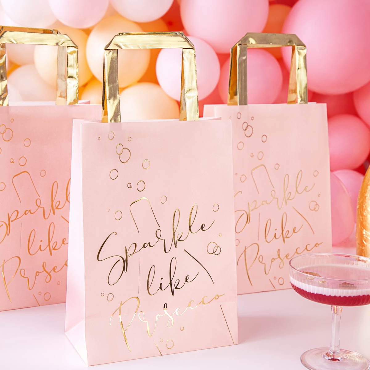 Kleine Geschenke elegant verpacken - das geht mit diesen schönen Papiertüten ganz einfach. Die rosafarbigen Tüten haben einen edlen Henkel aus goldfarbigem Papier und sind mit dem Spruch "Sparkle like Prosecco" bedruckt. Perfekt für stilvolle kleine Geschenke und Mitbringsel!