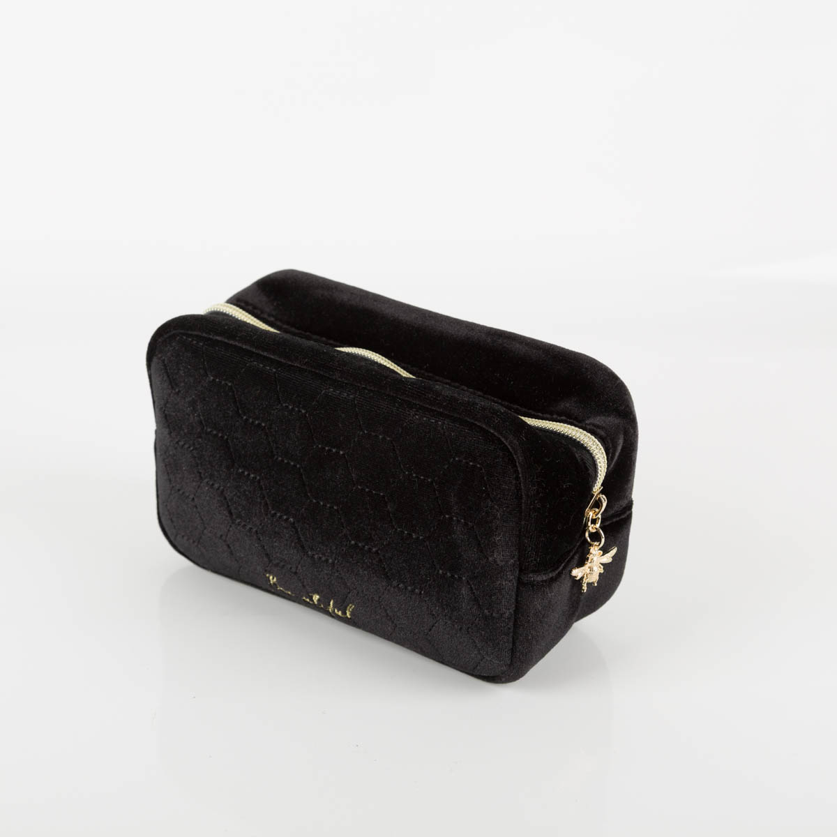 Dieses einzigartige Schminktäschchen aus der Sass & Belle Kollektion ist eine zauberhafte Aufbewahrung für deine Kosmetikschätze unterwegs. Das kleine Täschchen aus schwarzem Velour mit Wabenstruktur hat genau die richtige Größe für deine Handtasche. Das Innenleben besteht aus einem Innenfach, so siehst du alles auf einen Blick.