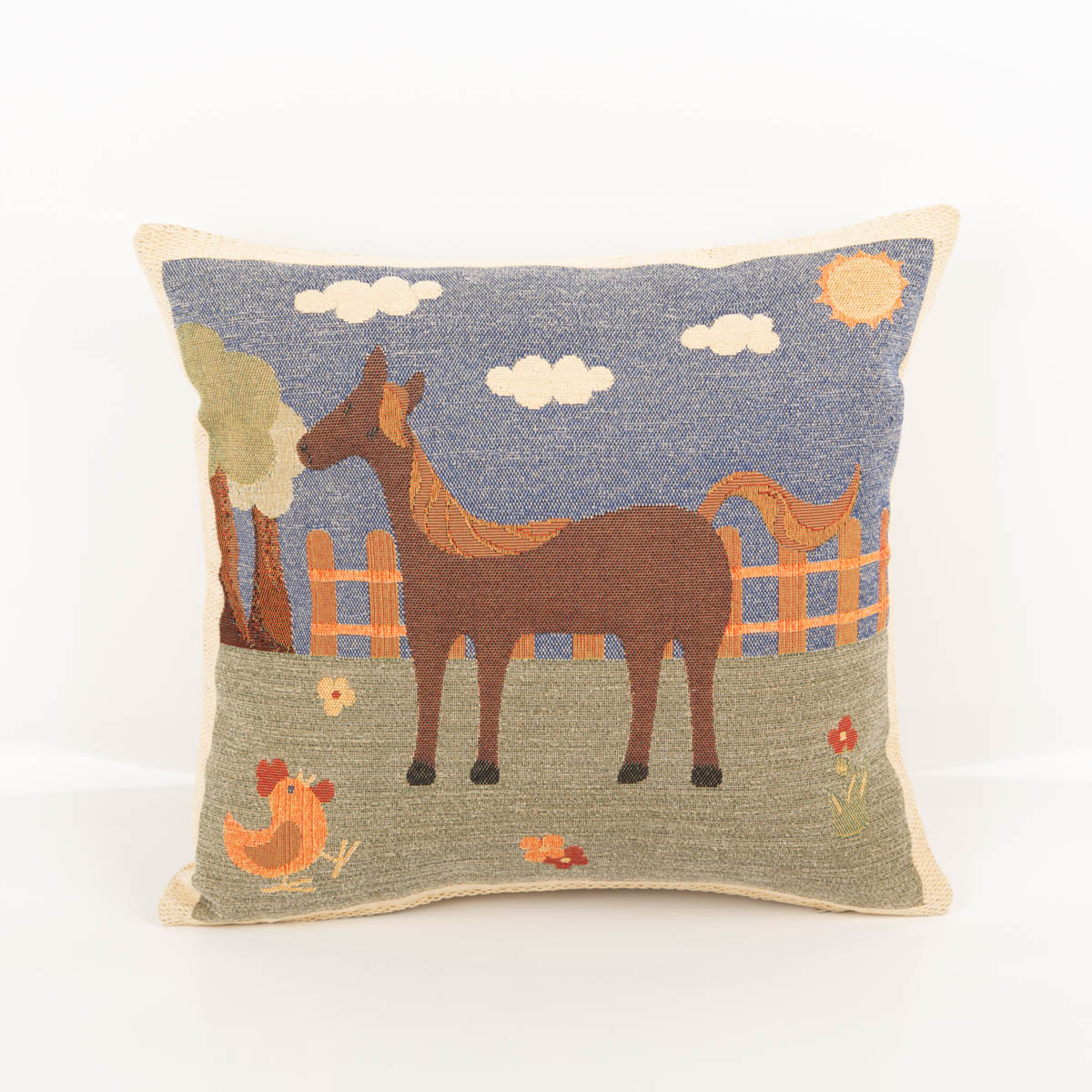 Gobelin Kissenhülle mit liebevoll eingewebtem Pferdemotiv für eine gemütliche und dekorative Wohnatmosphäre im Landhausstil