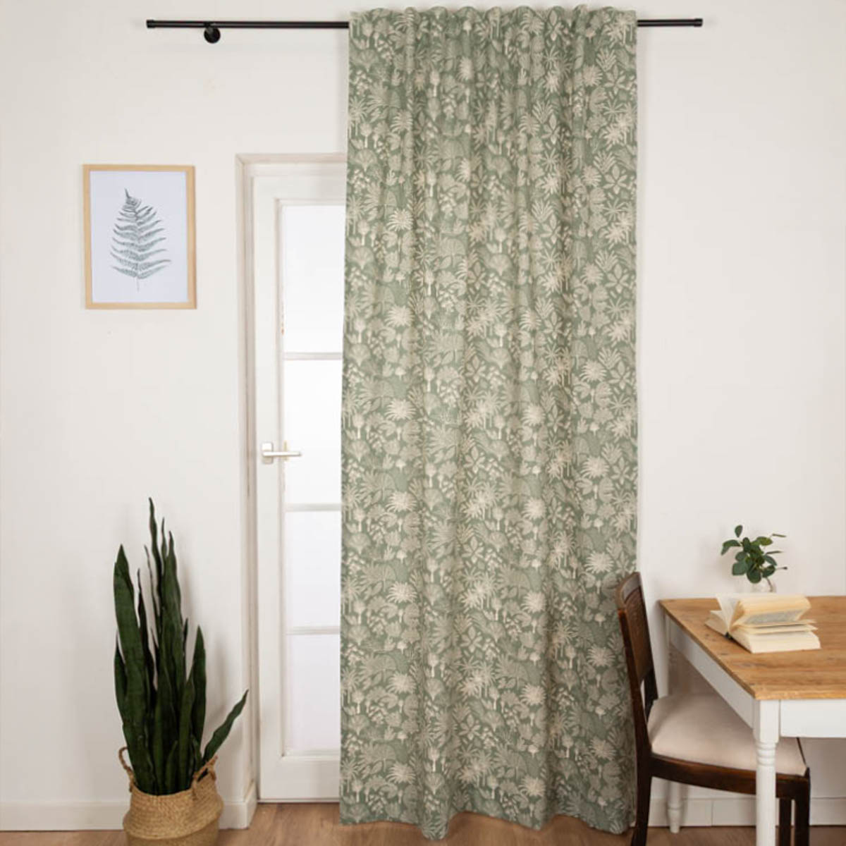 Exklusiver-Print: Das natürliche Dessin mit exotischen Blättern, Palmen und Pflanzen in Salbei-Grün ist ein einzigartiger Hingucker für deine Fenster.