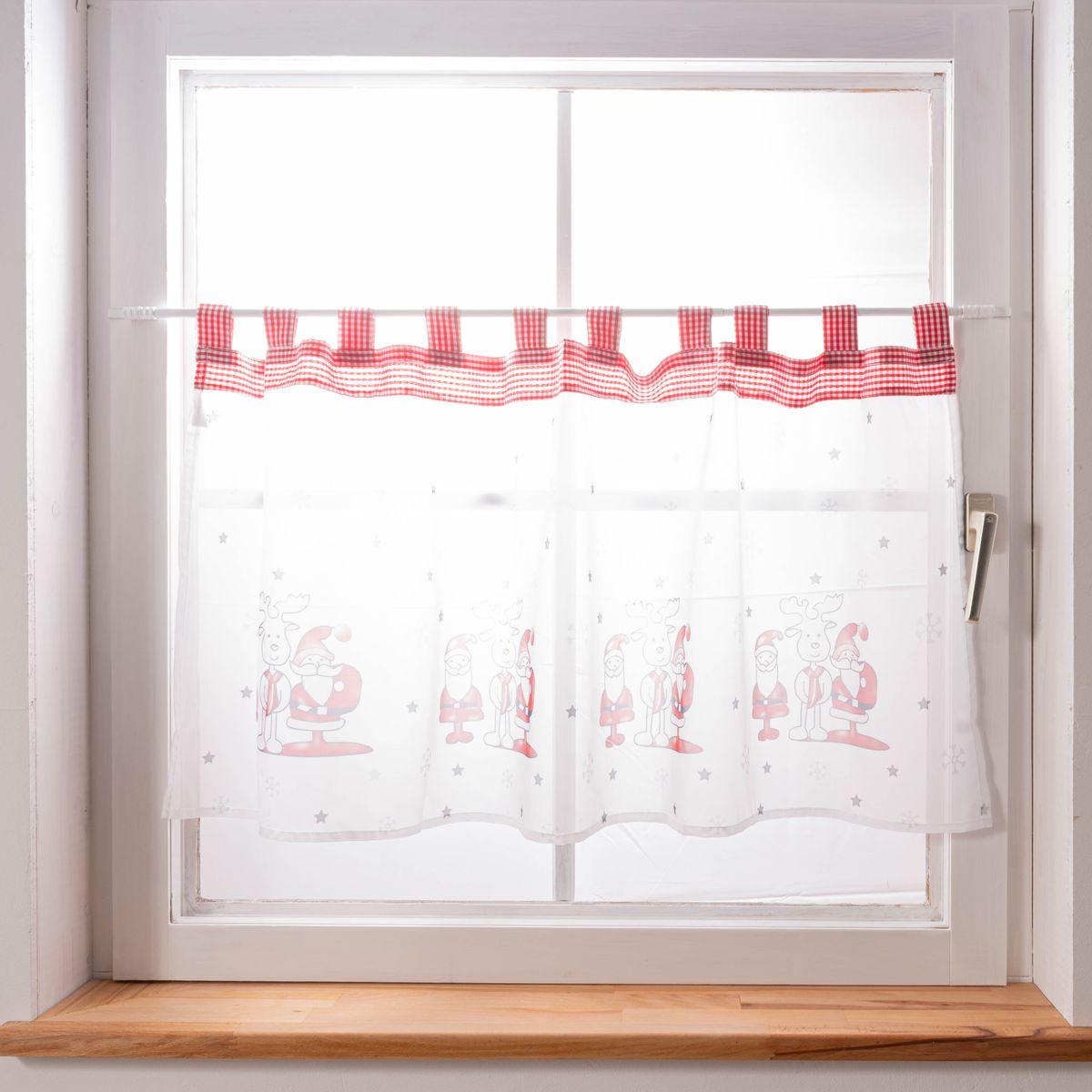 Festliche Atmosphäre: Die Weihnachtsgardine in Weiß, Rot und Grau mit Weihnachtsmann- und Elch-Motiv sorgt für eine gemütliche und herzliche Stimmung, ideal für die Feiertage.