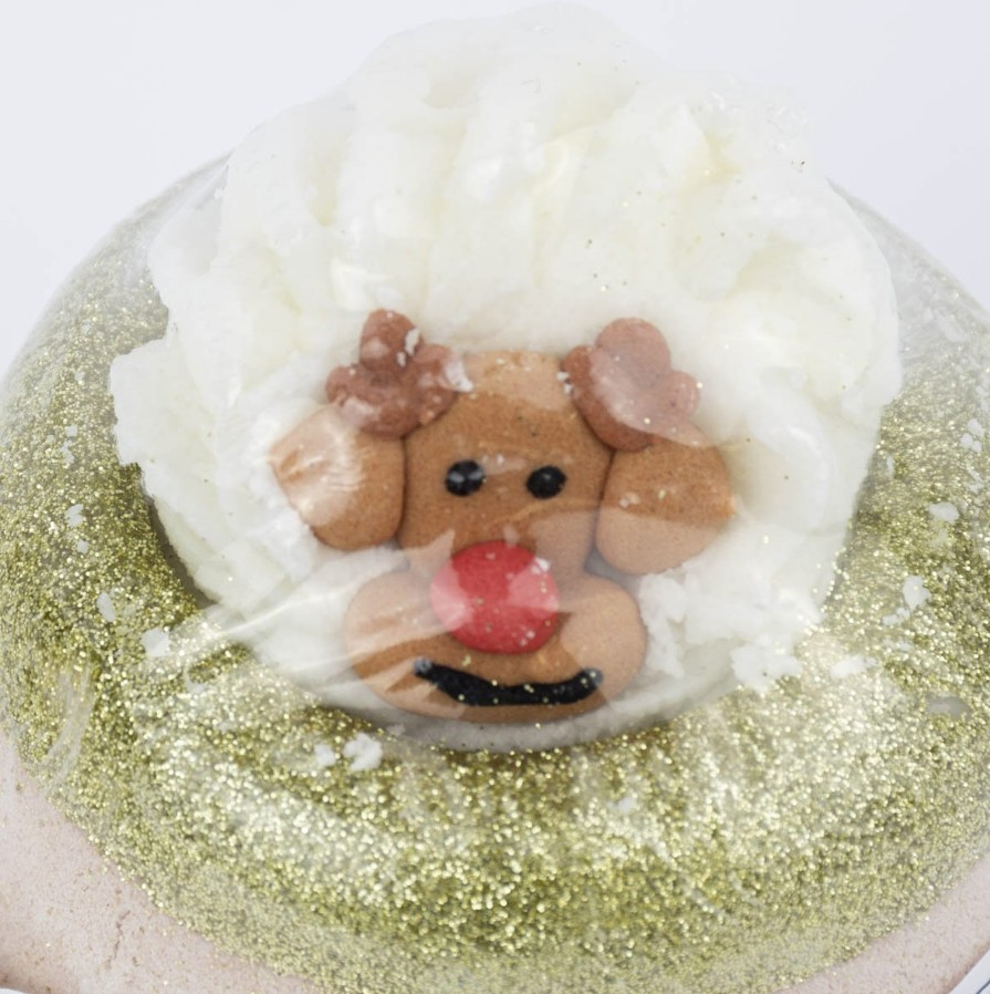 Handgemachte Badebombe mit Rentier-Deko & goldenem Glitzer