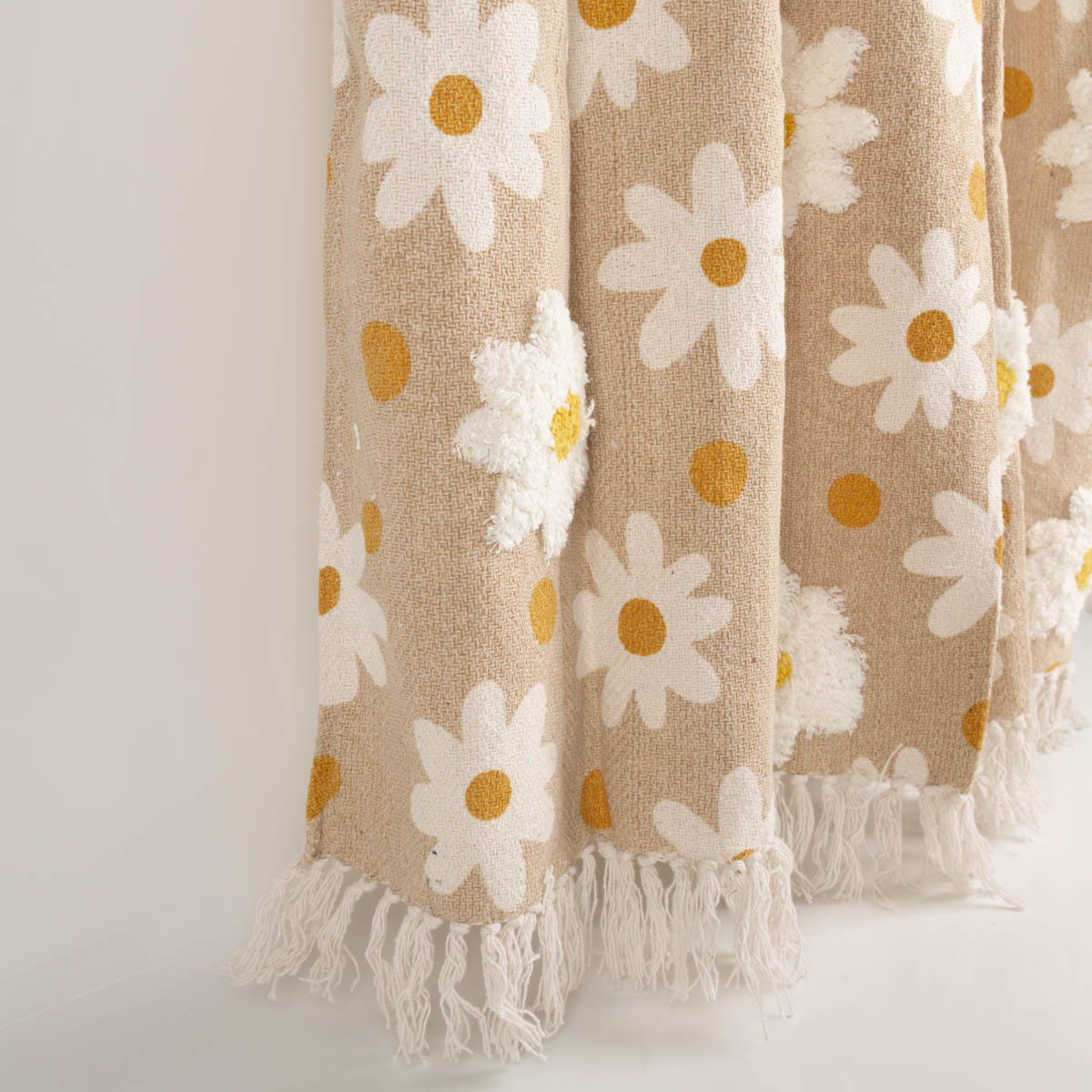 Getuftete Plaid-Decke mit Gänseblümchen-Motiv in Natur, Gelb und Weiß