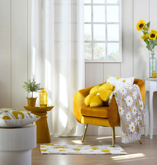 Getuftetes Gänseblümchen-Dessin in Natur, Gelb und Weiß für einen frischen, wohnlichen Look