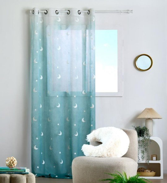 Du magst es hell, freundlich und ein bisschen magisch? Dieser transparente Voilevorhang verzaubert mit weiß gestickten Sternen und Monden auf sanftem Farbverlauf in Blau. Über 8 Metallösen (Innen-Ø ca. 4 cm) hängst du ihn im Handumdrehen auf – passend für Stangen bis 28 mm. Der Stoff fällt weich, ist bügelleicht und damit perfekt fürs Kinderzimmer, Schlafzimmer oder Leseecken.