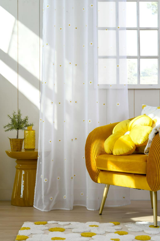 Die weiße Grundfarbe sorgt für Helligkeit und lässt sich vielseitig kombinieren. Die gelbe Blütenstickerei bringt Wärme und einen frischen Farbakzent ins Spiel. Gerade in hell eingerichteten Räumen oder in Kombination mit natürlichen, freundlichen Wohnfarben kommt dieser Vorhang besonders schön zur Geltung.