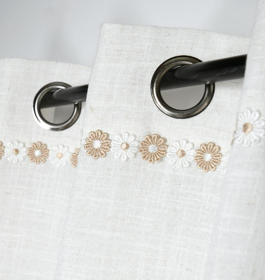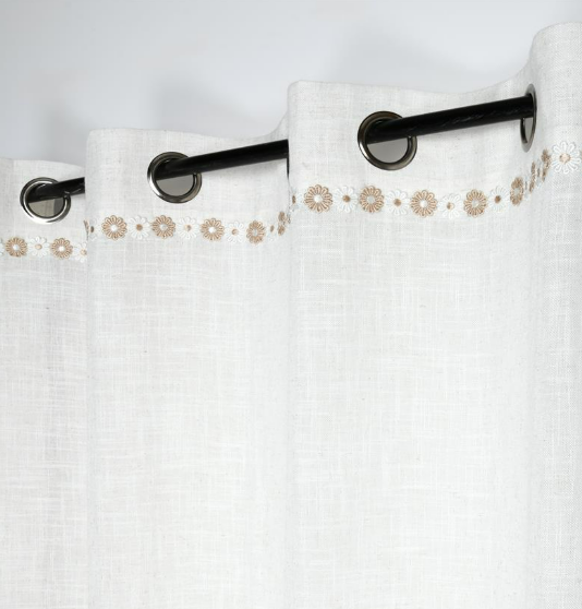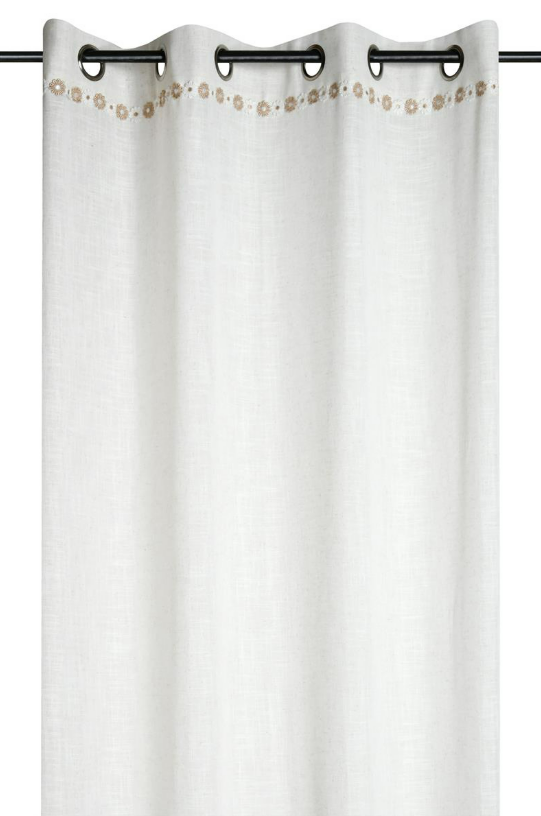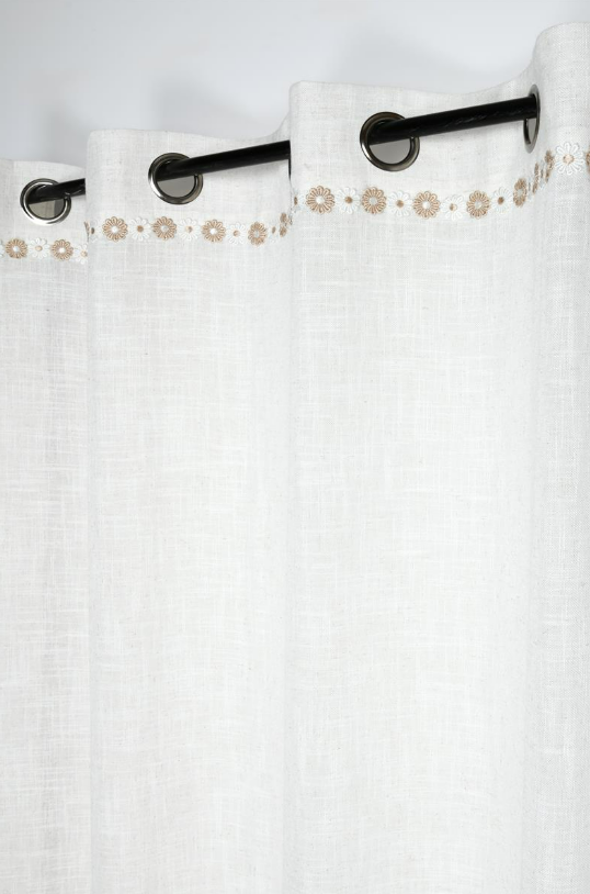 Halbtransparenter Ösenvorhang in Natur mit feiner Blumenborte und natürlicher Leinenstruktur für eine helle und wohnliche Fensterdekoration