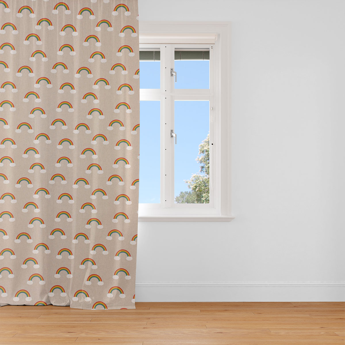 Wunderschöner Vorhang aus unserer SCHÖNER LEBEN.-Kollektion mit fröhlichem Regenbogen-Wölkchen-Print.