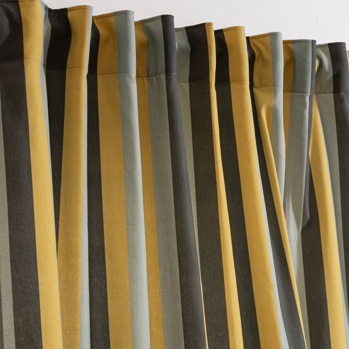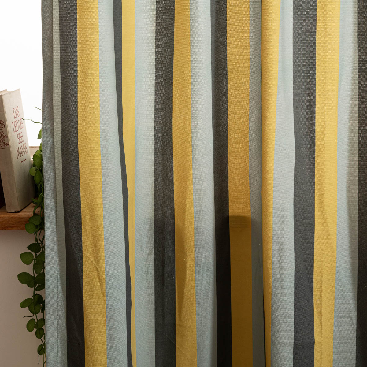 Dazu passt der Vorhang mit Streifen in Grün, Grau und Blau