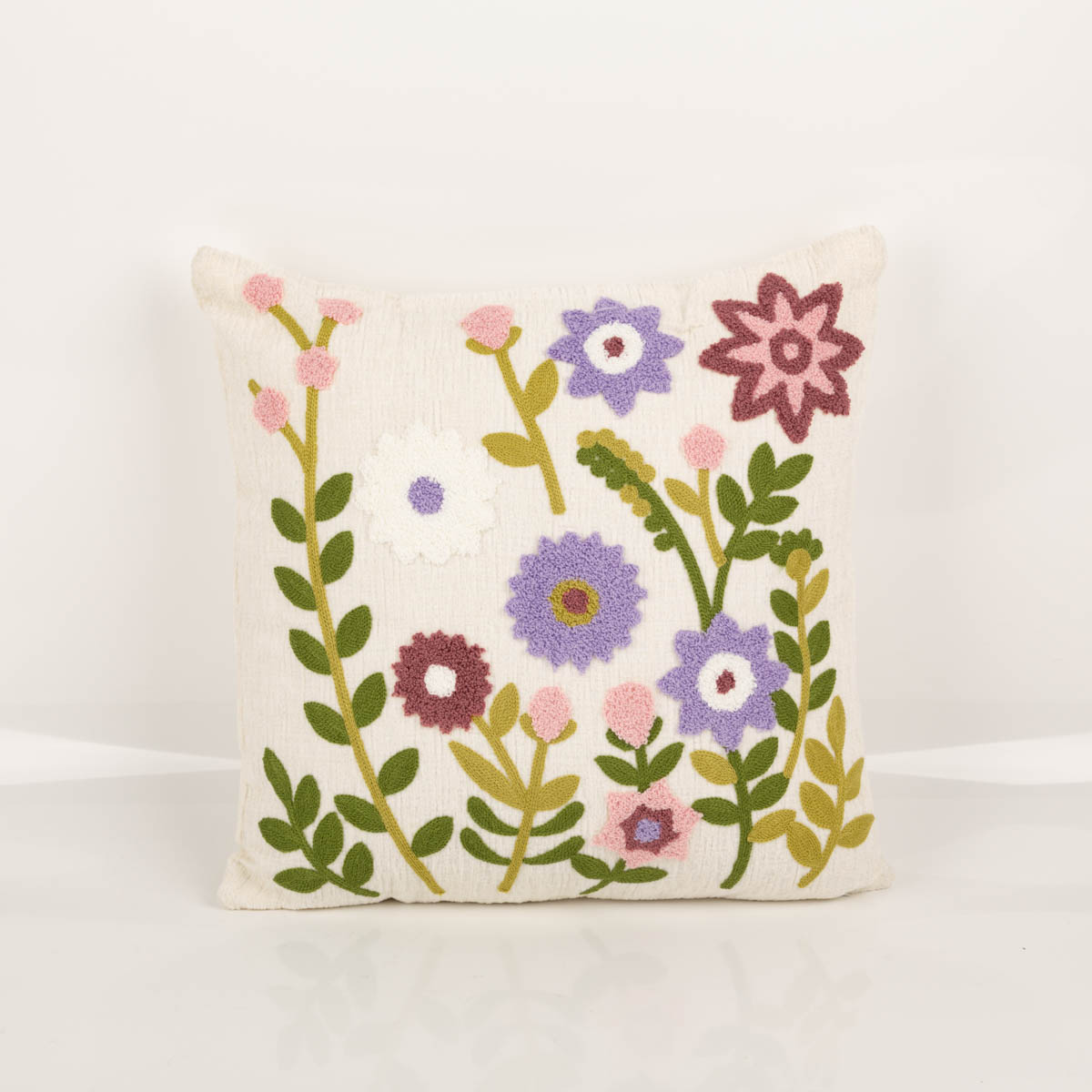Kissen Blumen aus Chenille in Wollweiß, Grün, Rosa und Lila