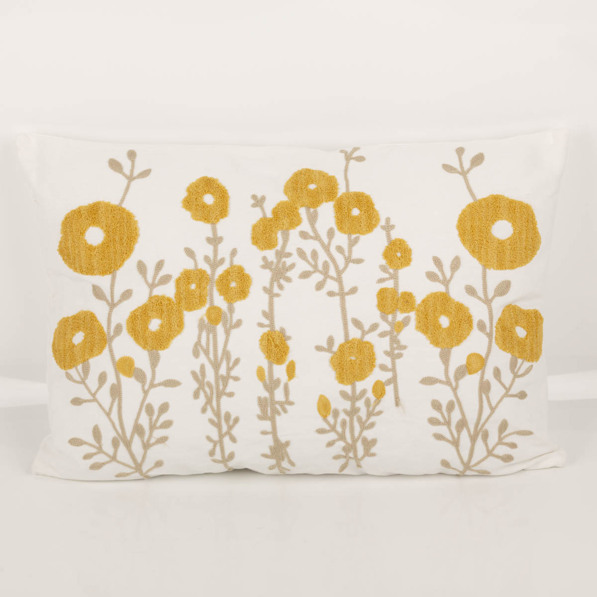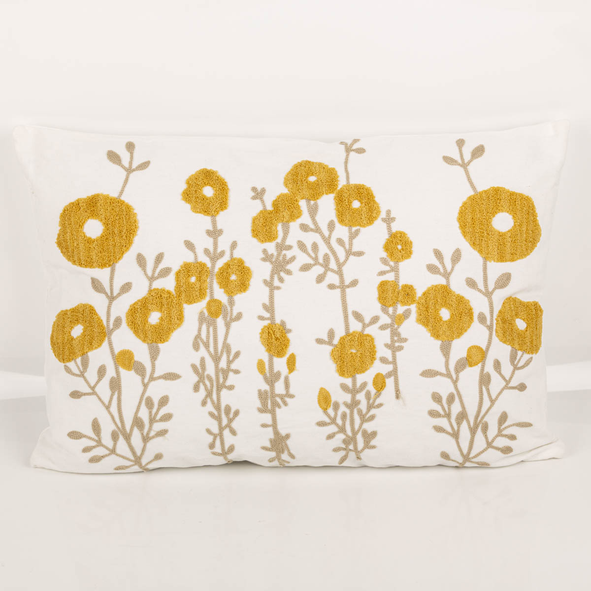Dekokissen 40 x 60 cm in Wollweiß mit gelben getufteten Blüten und gestickten Blättern sowie Stielen in Beige für eine freundliche und natürliche Wohnatmosphäre