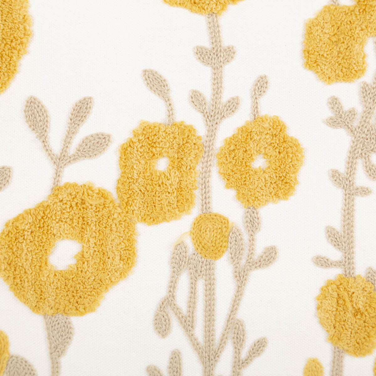 Die Vorderseite macht dieses Kissen zu etwas Besonderem. Die gelben Blüten sind getuftet und heben sich dadurch plastisch von der Oberfläche ab. Ergänzt werden sie durch gestickte Blätter und Stiele in Beige, die dem Motiv Leichtigkeit und eine feine Linienführung geben.