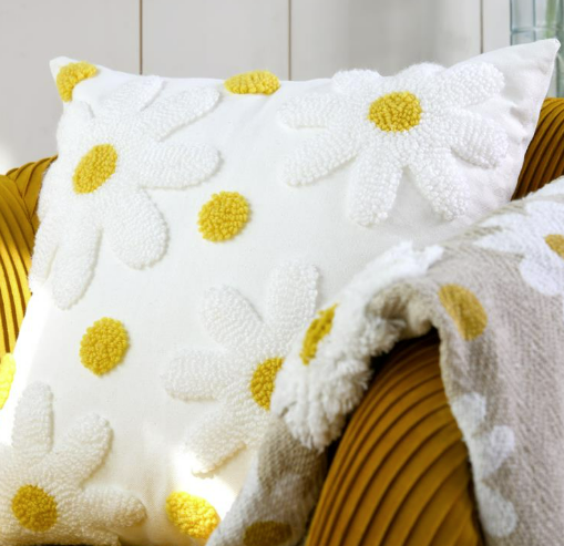 Du möchtest ein Kissen, das sofort nach Frühling, Leichtigkeit und gemütlichem Zuhause aussieht? Das Kissen Camille bringt getuftete Blüten in wollweiß mit sonnig gelben Blütenmitten auf eine ruhige Basis. Die strukturierte Tufting-Optik macht den Look lebendig und fühlt sich gleichzeitig angenehm weich an – perfekt, wenn du in deinem Wohnbereich natürliche Akzente setzen willst.