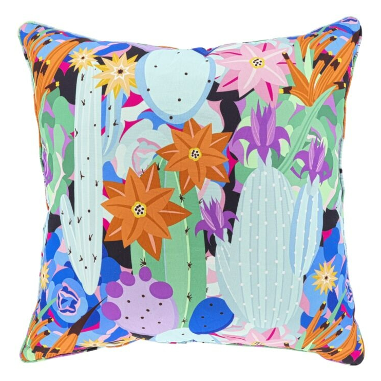 Du möchtest deine Gartenmöbel oder deinen Balkon in eine farbenfrohe Wohlfühloase verwandeln? Dieses hochwertige Outdoor Kissen im Format 50x50 cm bringt lebendige Frische direkt zu dir nach draußen. Das detailreiche Design mit verschiedenen Kakteen und prachtvollen Blüten in kräftigen Farben ist ein echter Blickfang und sorgt für ein modernes Ambiente auf deiner Terrasse.