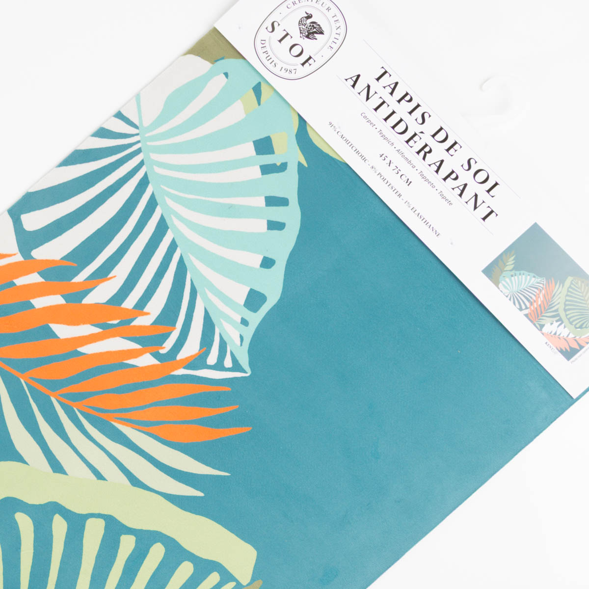 Diese waschbare Fußmatte in frischem Türkis bringt mit ihrem farbenfrohen Blätter-Motiv echtes Urlaubsfeeling in dein Zuhause. Das moderne Design stammt aus Frankreich und kombiniert kräftige Farben mit funktionalem Komfort.