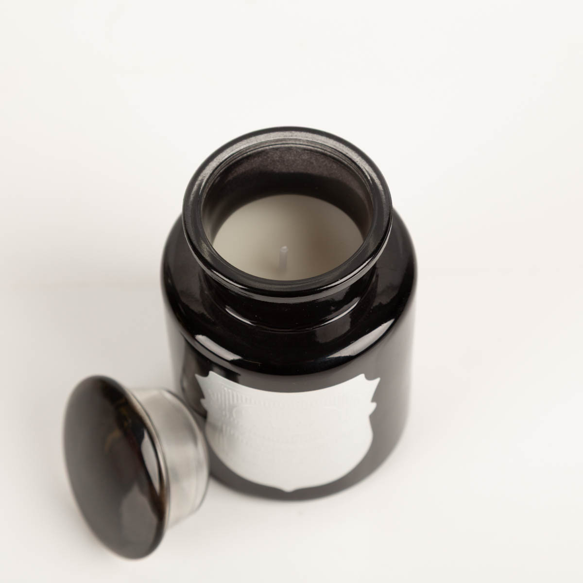 Die Duftkerze besteht aus Sojawachs und wird in einem schweren Glasgefäß im klassischen Apothekerstil gegossen. Das dunkle Glas unterstreicht den edlen Charakter und macht die Kerze auch unangezündet zu einem dekorativen Wohnaccessoire.