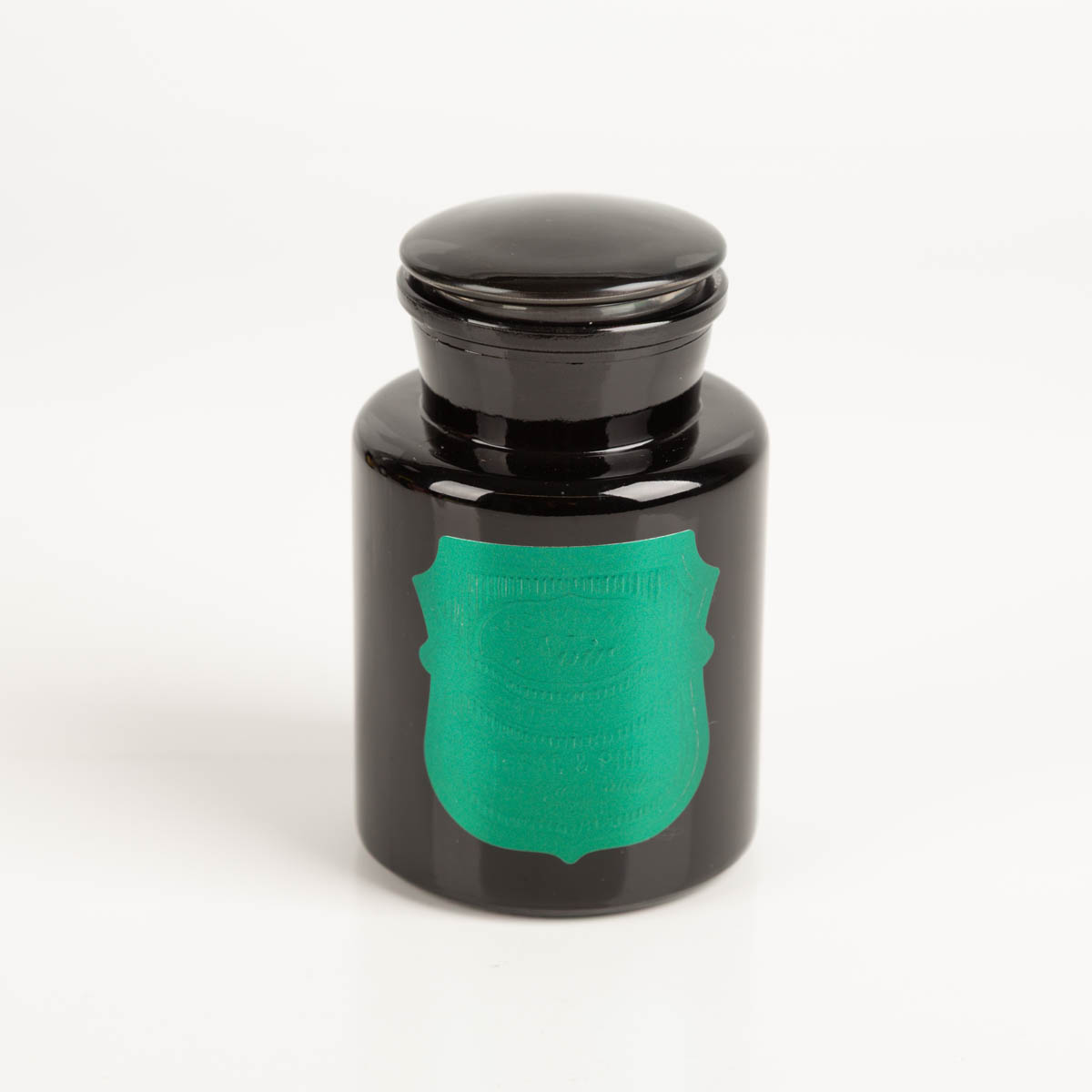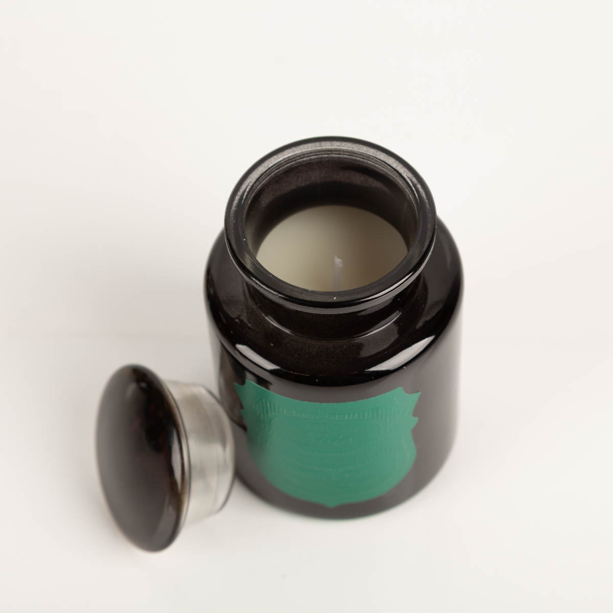 Die Duftkerze wird aus Sojawachs gefertigt und befindet sich in einem schweren Glasgefäß im klassischen Apothekerdesign. Das dunkle Glas unterstreicht den edlen Charakter und macht die Kerze auch unangezündet zu einem stilvollen Wohnaccessoire.