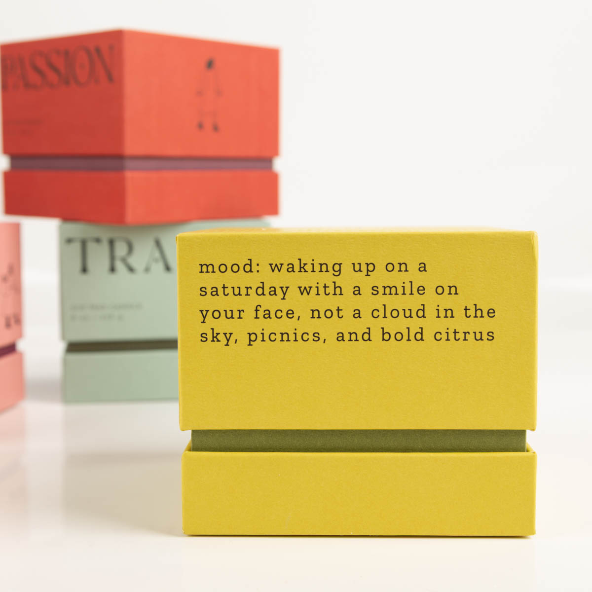 Die Kerze wird in einem schlichten Glastopf mit stimmungsvollem Label präsentiert und in einer hochwertigen Geschenkbox mit handgezeichneter Illustration geliefert. Das frische, farbenfrohe Design macht sie ideal als Geschenk oder als fröhliches Wohnaccessoire.