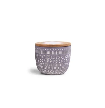 Sojaduftkerze im handveredelten Betongefäß mit Holzdeckel