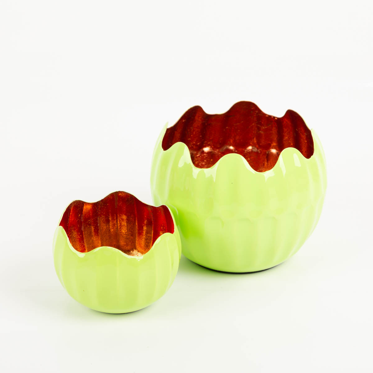 Windlicht Holi Neon-Grün Kupfer 15x12 cm: großer Farbakzent mit warmem Kerzenlicht