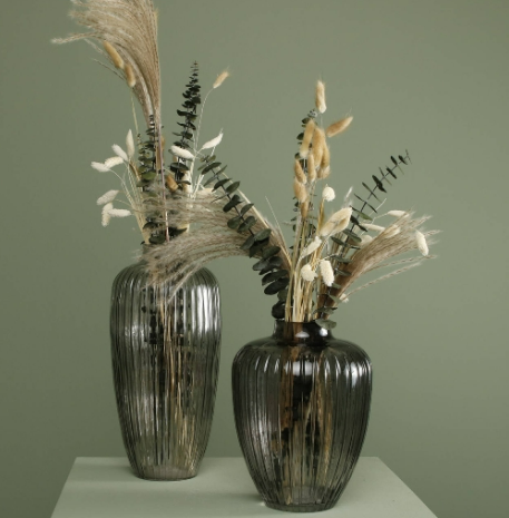 Gerillte Glasvase in Grau: moderner Blickfang für Trockenblumen und Sträuße